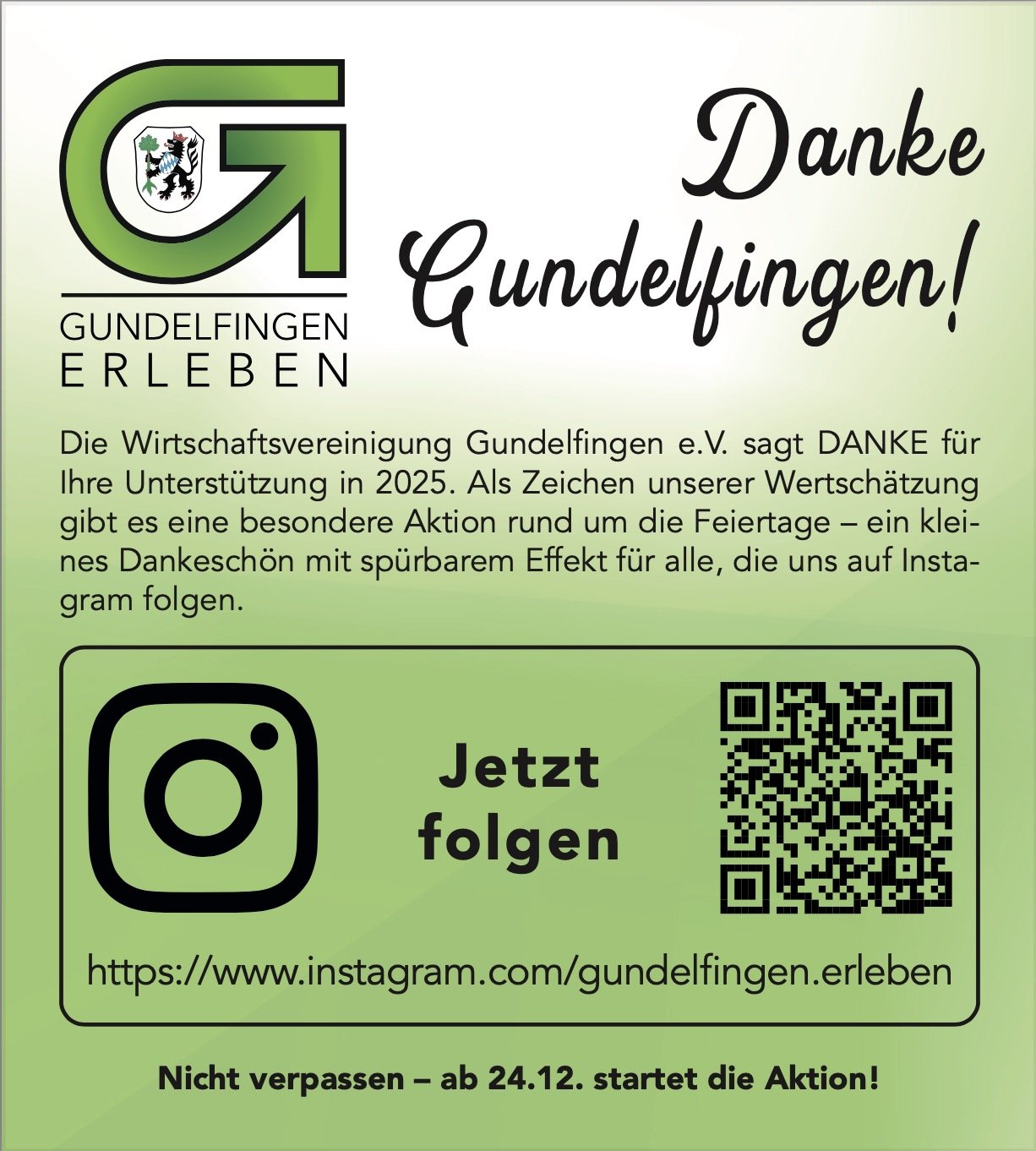 Jetzt folgen und im Aktionszeitraum 10 % Nachlass auf Gundelfinger Einkaufschecks erhalten.