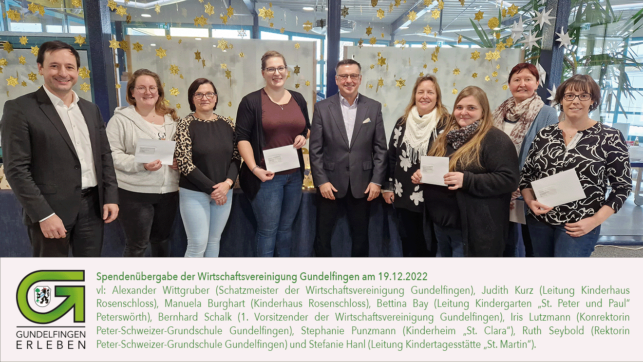 Die Wirtschaftsvereinigung Gundelfingen e.V. spendet 1.400 EUR aus dem Erlös der Weihnachtsmarktverlosung an die Gundelfinger Kindergärten und die Grundschule.