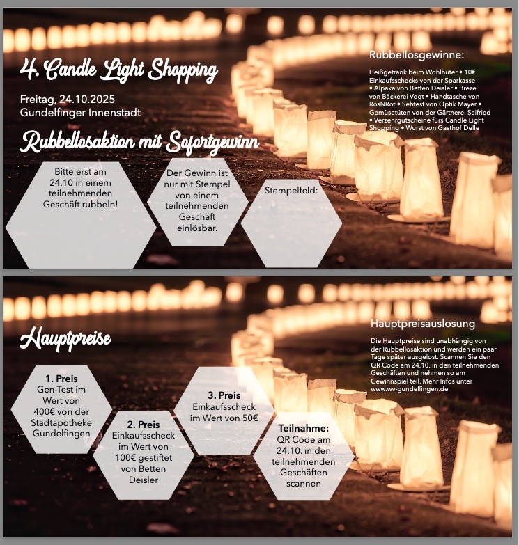 Am Freitag, den 24. Oktober, verwandelt sich Gundelfingens Innenstadt ab 17 Uhr wieder in ein leuchtendes Einkaufsviertel. Candle Light Shopping ist mehr als ein Abend mit offenen Geschäften – es ist ein Fest für die ganze Stadt. Die Straßen werden liebevoll beleuchtet, Musik begleitet die Besucher durch die Geschäfte und viele Betriebe überraschen mit besonderen Aktionen, kleinen Leckereien und stimmungsvoller Dekoration.